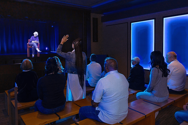 Dimensions in Testimony℠ from USC Shoah Foundation offers visitors the rare opportunity to sit across from a Holocaust Survivor and ask them questions about their life and survival.